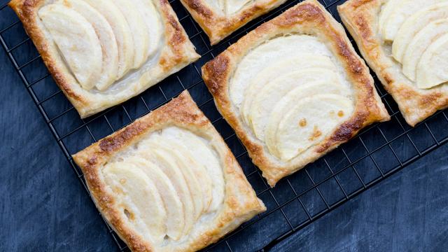 • عجينة البف باستري<br /> • 4/1 كوب سكر<br /> • 1 بيضة<br /> • 2 حبة تفاح<br /> • 4 ملاعق كبيرة حليب مكثفطريقة التحضير :