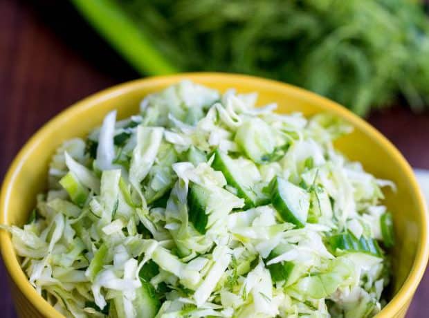 • 2/1 رأس ملفوف متوسط الحجم<br /> • 2 حبة خيار متوسطة الحجم<br /> • 1 ملعقة كبيرة خل أبيض<br /> • 1 ملعقة كبيرة زيت زيتون<br /> • ملح وفلفل حسب الذوق<br /> • 2/1 كوب شبت طازج مفروم<br /> • 1 كوب بصل مفرومطريقة التحضير :