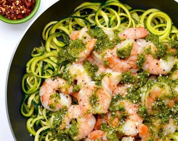 • 675 جرام جمبري • 2 ملعقة كبيرة زيت زيتون • 4 حبات كوسة متوسطة الحجم ومقطعة إلى شعيرية • ملح وفلفل لصوص البيستو : • 3/1 كوب مبشور جبن البارميزان • 3 فصوص ثوم مفروم • 3/1 كوب جوز أو صنوبر أو لوز غير مملح • 4 أكواب أوراق الريحان الطازجة • 2/1 كوب زيت زيتون • 2/1 ملعقة صغيرة ملح • 4/1 ملعقة صغيرة فلفل أسودطريقة التحضير :