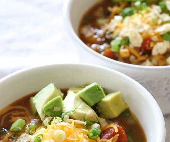• خليط التوابل :- • 1 ملعقة كبيرة مسحوق الفلفل الاحمر الحار • 1 ملعقة صغيرة قرفة • 2 ملعقة صغيرة ملح • 1/8 ملعقة صغيرة قرنفل مطحون • 1/2 ملعقة صغيرة جوزة الطيب • 1/4 ملعقة صغيرة رقائق الفلفل الاحمر • مقادير أخرى :- • 2 ملعقة صغيرة زيت زيتون • 1 بصلة مقطعة مكعبات • 2 فص ثوم مفروم • 2 ملعقة كبيرة زنجبيل طازج مفروم ناعم • 1 فلفل اخضر حار مفروم • 2 جزر مقطع مكعبات • 4 حبة فطر كبير الحجم مقطع مكعبات • 2 كوب ذرة مجمدة • 1 علبة طماطم مشوية • 1 علبة هريس القرع • 1 علبة فاصوليا حمراء مصفاة • 2 كوب مرق خضار غير مملح • للتزيين :- • 2 أفوكادو صغير الحجم مقطع مكعبات • 5 بصل أخضر مقطع شرائح • 10 ملعقة كبيرة جبن شيدر مبشورة قليلة الدسم • 5 ملعقة كبيرة ساور كريم قليل الدسم • خبز التورتيلا مقطع للتزيين • كزبرة طازجة مفرومةطريقة التحضير :