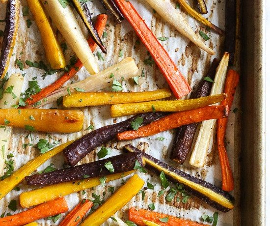 تبلى أصابع الجزر الملونة بكلا من ( 2 ملعقة صغيرة زيت الزيتون –
