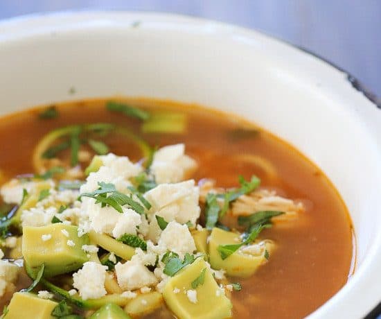 • 450 جرام صدور دجاج بدون جلد وعظم • 1/2 ملعقة صغيرة ملح • 1/4 ملعقة صغيرة فلفل أسود • 1 ملعقة صغيرة زيت زيتون • 1/2 كوب بصل مفروم • 3 فص ثوم مفروم • 4 كوب مرق دجاج بدون ملح • 225 جرام صلصة طماطم • 1/2 ملعقة صغيرة فلفل أحمر حار مفروم • 1 ملعقة صغيرة زعتر مجفف • 1/4 ملعقة كمون • 2 ورق غار • 1/4 كوب كزبرة مفرومة • 200 جرام كوسا • 1 حبة أفوكادو متوسطة الحجم مقطعة شرائح • 50 جرام جبن بارميزان مبشورة