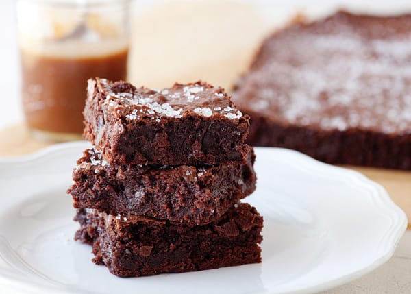 للكراميل المملح : • 1 كوب سكر • 4/1 كوب ماء • 2 ملعقة كبيرة شراب الذرة أو العسل • 2/1 كوب كريمة • 1 ملعقة صغيرة ملح خشن • 4/1 كوب ساور كريم للبراونيز : • 4/1 1 كوب طحين • 2/1 ملعقة صغيرة ملح • 2 ملعقة كبيرة كاكاو • 309 جرام شوكولاتة خام • 1 كوب زبدة • 2/1 1 كوب سكر • 2/1 كوب سكر بني • 5 بيضات في درجة حرارة الغرفة • 2 ملعقة صغيرة فانيليا سائلة • 1 ملعقة صغيرة سكر خشنطريقة التحضير :