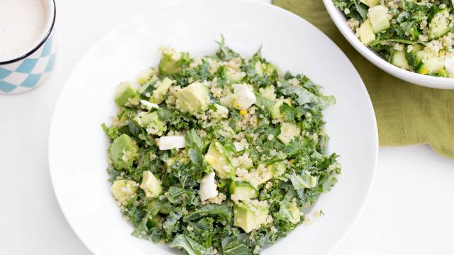 • 1 كوب كينوا مسلوقة<br /> • 4 أكواب جرجير مفروم<br /> • 2 حبة أفوكادو<br /> • 2 بيض مسلوق<br /> • 1 حبة خيار مفروم<br /> • صوص الرانشطريقة التحضير :