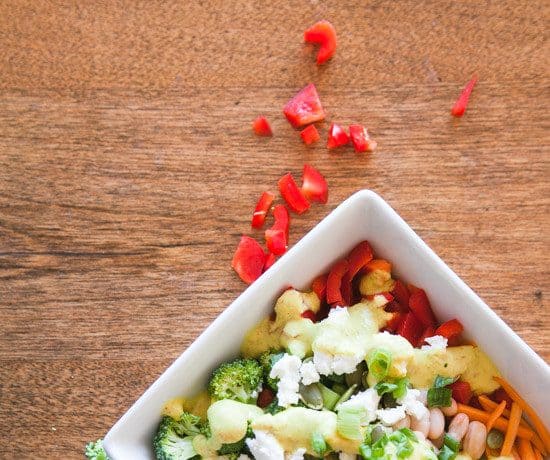 • 3/1 1 كوب من الكينوا المطبوخة • 2 كوب مكعبات صدور دجاج مشوية • 3/1 1 كوب من زهيرات البروكلى • 3/1 1 كوب من مكعبات الفلفل الأحمر الحلو • 3/1 1 كوب من الجزر المبشور • 1/2 كوب فاصوليا بيضاء مسلوقة • 1/4 كوب بذور اليقطين مقشرة • 1/4 كوب بصل أخضر مفروم • 1/4 كوب جبن فيتا مفتتة • مقادير الصلصة :- • 1/2 كوب لوزخام • 3 عصير ليمون • 1 فص ثوم • 1 ملعقة صغيرة عسل • 1 ملعقة صغيرة كركم • 2 ملعقة صغيرة ملح • 10 أوراق ريحان طازجطريقة التحضير :
