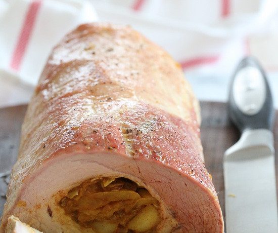قومى بوضع حشوة التفاح والبصل داخل هذه الفتحات الموجودة فى اللحم ثم