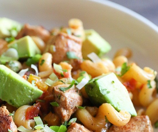 قدمى طبق المكرونة بفاهيتا الدجاج مع مكعبات الأفوكادو .
