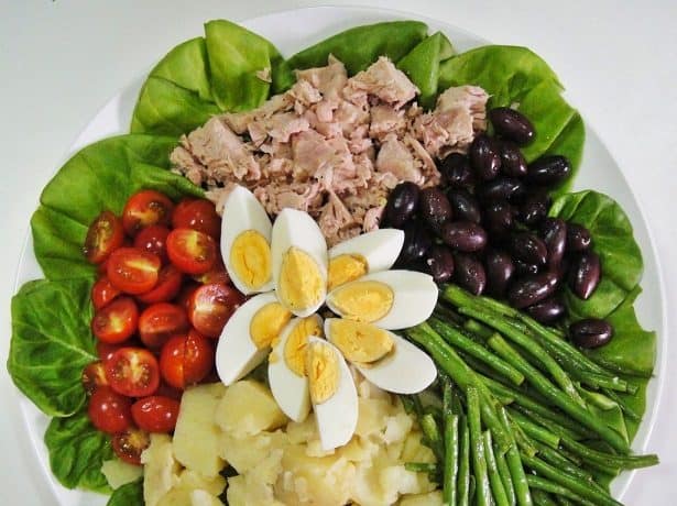 • 1 رأس خس كابوتشا • 250 جرام فاصوليا خضرا طازجة • 1 بطاطا كبيرة الحجم مسلوقة • 1 كوب طماطم كرزية مقطعة أنصاف • 1/2 كوب زيتون كالاماتا • 3 : 4 بيض مسلوق • 2 علبة تونة مصفاة • مقادير الدريسنج :- • 3 ملعقة صغيرة خردل ديجون المحبب • 1 ملعقة صغيرة صلصة توباسكو • 1 فص ثوم مبشور • 2 عصير ليمونة • 2/1 1 ملعقة صغيرة ملح وفلفل أسود • 1/2 كوب زيت زيتونطريقة التحضير :