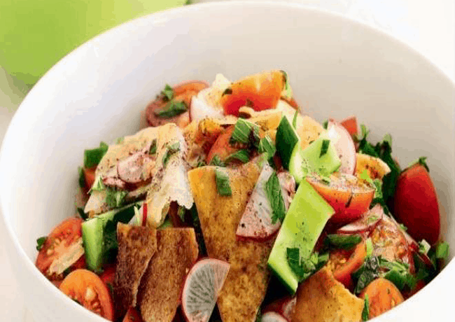 4.      يزين سطح الفتوش بباقى الخبز المحمص والفجل