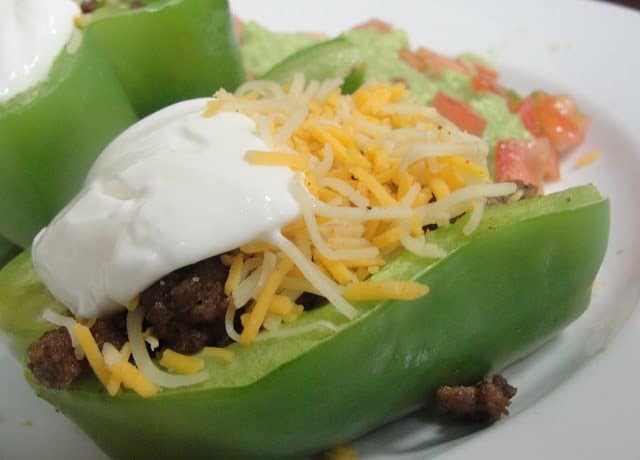 • 3 حبة فلفل أخضر حلو كبيرة الحجم ( فلفل رومى )<br /> • 1/4 كيلو لحم مفروم<br /> • 2 ملعقة كبيرة توابل التاكو المكسيكية <br /> • 1/4 كوب ماء <br /> • 1 ملعقة كبيرة جبن شيدر مبشورة <br /> • خليط جبن مكسيكى ( الكمية حسب الرغبة )<br /> • كريمة حامضة <br /> • 1 ملعقة كبيرة زبدة <br /> • ملح وفلفل أسود