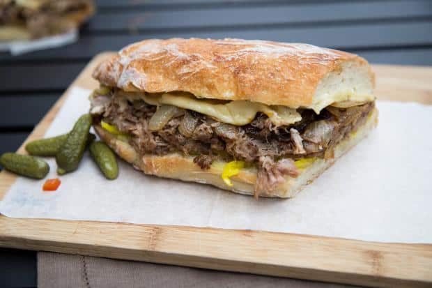لتتبيل اللحم : • 1800 جرام لحم بقري ( من الكتف ) • 2 كوب عصير برتقال • 3 حبات ليمون • 6 فصوص ثوم مفروم خشن • بصلة مقطعة مكعبات • 1 ملعقة كبيرة ملح • 2/1 ملعقة كبيرة فلفل • 2 ملعقة كبيرة بقدونس للساندويش : • 2 رغيف خبز فرنسي • 2 حبة بصل متوسطة الحجم • 1 كوب مخلل الهالبينو الحلو مقطع شرائح • 8 شرائح جبن سويسري أو جودة أو شيدر للثومية : • 1 كوب مايونيز • 1 ملعقة كبيرة بقدونس مفروم • 3 فصوص ثوم مفروم ناعماًطريقة التحضير :