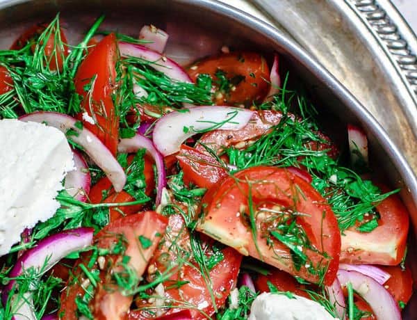 • 7 حبات طماطم متوسطة الحجم • 1 حبة بصل أحمر متوسطة الحجم • 3 فصوص ثوم مفروم • 1 كوب بقدونس طاظج مفروم • 2/1 2 ملعقة صغيرة سماق مطحون • ملح وفلفل • عصير ليمونة واحدة • 2 ملعقة صغيرة خل أبيض • 2/1 كوب زيت زيتون • جبن فيتا (اختياري)طريقة التحضير :