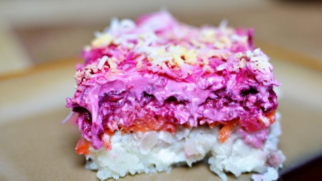 • 3 حبات بطاطس صغيرة الحجم مسلوقة • 450 جرام سمك مملح (رنجة أو أي نوع، مخلي من الشوك) • بصة صغيرة الحجم مفرومة ناعماً • 3 حبات بنجر متوسطة الحجم مسلوقة • 3 حبات جزر متوسطة الحجم مسلوقة • 1 كوب مايونيزطريقة التحضير :