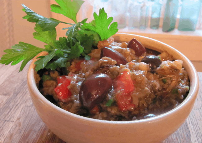 يغرف الباذنجان ويجمل بحبات الزيتون وأوراق البقدونس