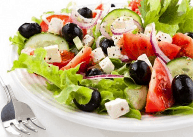 خس 2 ثمرة طماطم كرفس بصلتان متوسطتان حلقات ربع كيلو جبن أبيض مكعبات ثمرتان فلفل رومى أخضر وأحمر مقطعه حلقات 5 حبات فجل أحمر أوراق النعناع الطازجة رغيف توست ملعقة كبيرة زيت زيتون ملعقة كبيرة عصير ليمون ملح – فلفلطريقة التحضير :