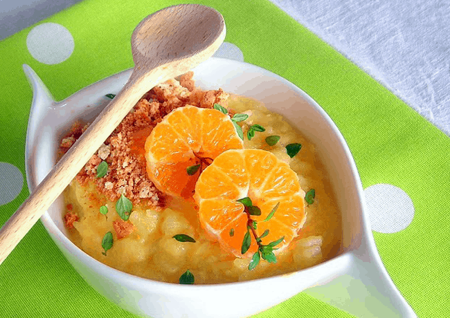 يرفع من فوق النار ويترك ليبردثم قومى بإضافة علبة القشطة وإرفعيه مرة ثانية على النار لمدة دقيقة مع التقليب ، ويجمل باليوسفى منزوعة