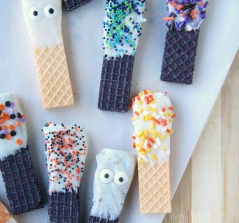 • بسكويت ويفر • شوكولاتة بيضاء مذابة • رشات ملونة ( شوكولاتة فارمسيلي الهالوين )طريقة التحضير :
