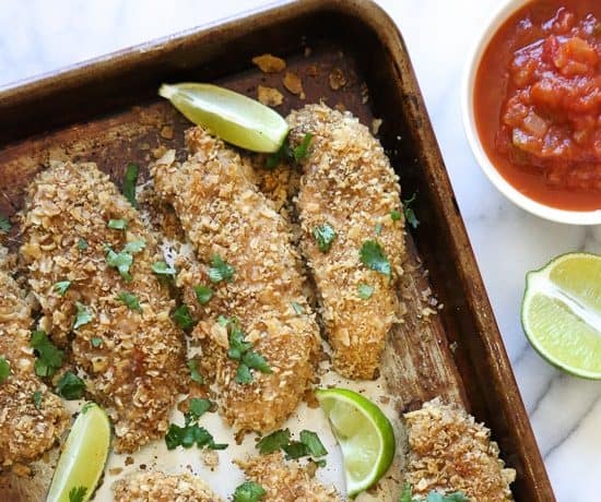• 8 صدور دجاج بدون جلد وعظم • 1 ملعقة صغيرة ملح • 1/2 ملعقة صغيرة فلفل أسود • 2 ملعقة كبيرة طحين • 1 بيضة مخفوقة • 100 جرام رقائق الدوريتوس ( تورتيلا ) مطحونة • 1 ملعقة صغيرة بودرة ثوم • 1 ملعقة صغيرة كمون • القليل من زيت الزيتون • ليمونة مقطعة أرباع • كزبرة طازجة مفرومة للتزيين • 1/2 كوب صلصة حارة للغموس