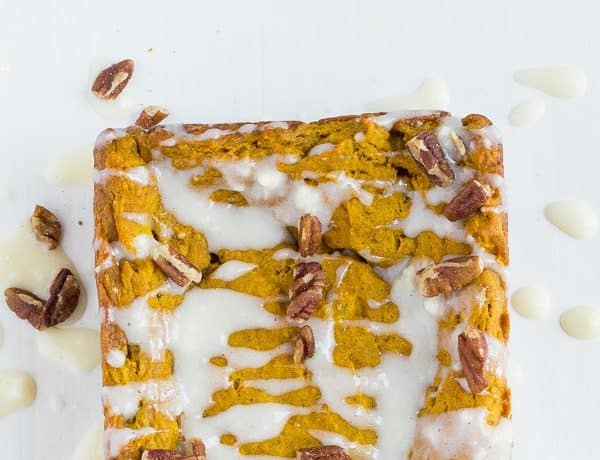 لمدة 55 دقيقة – 1 ساعة ثم اخرجي الخبز من القالب واتركيه ليبرد قليلاً ثم زيني سطحه صوص كريمة الجبن الحلو ورشي المكسرات على سطحها.