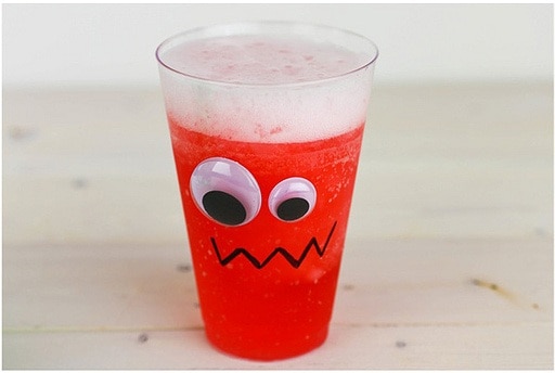 • أكواب بلاستيكية • لاصق • عيون بلاستيكية • قلم تلوين أسود • عصير أحمر ( توت، كرز، فراولة ) • 3/1 كوب سفن أب • 4 أكواب ثلج