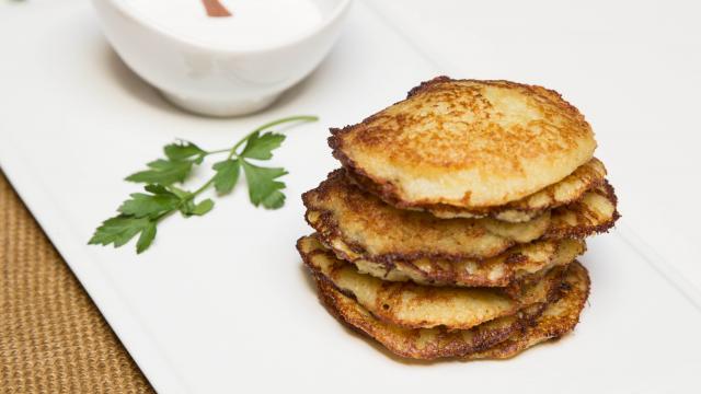 قدمي بان كيك البطاطس مع الكريمة الحامضة.