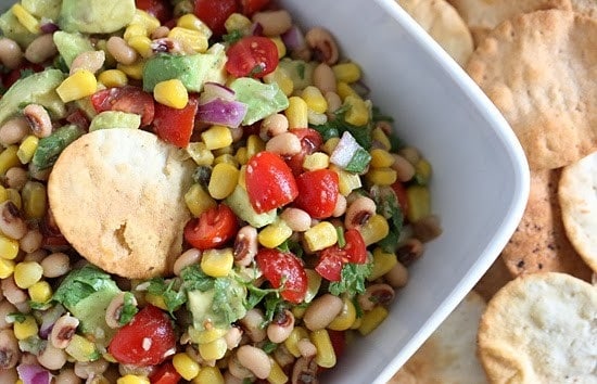 • 1 علبة لوبيا مصفاة ( فاصوليا أم عيون سوداء ) • 2 فص ثوم مفروم • 3 ملعقة كبيرة عصير ليمون • 1 ملعقة كبيرة زيت زيتون • 1 ملعقة صغيرة كمون • رشة من رقائق الفلفل الاحمر الحار • 1/2 ملعقة صغيرة ملح • 1 كوب ذرة مسلوقة • 1 كوب طماطم مقطعة مكعات صغيرة • 1/4 كوب بصل أحمر مقطع مكعبات صغيرة • 1/4 كوب كزبرة مفرومة • 1 فلفل أخضر حار مفروم ( اختياري ) • 1 حبة أفوكادو متوسطة الحجم مقطعة مكعبات صغيرة