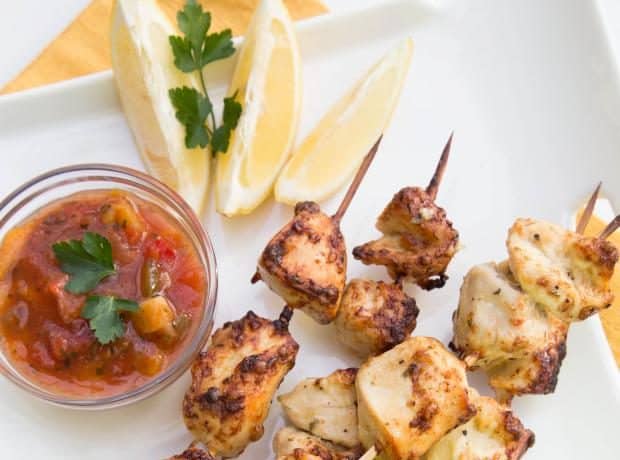 قدمي كباب الدجاج مع قلاية الطماطم والخبز العربي، صحتين وهنا.