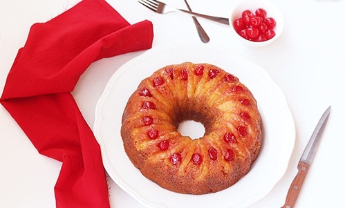 • 1/2 كوب زبدة مذابة <br /> • 1/2 كوب سكر بنى <br /> • 565 جرام شرائح كمبوت الأناناس<br /> • 1 علبة كمبوت الكرز <br /> • 1 علبة خليط الكيك الأصفر ( الجاهز )<br /> • 1 علبة بودنج الفانيليا ( جاهز )<br /> • 1/3 كوب حليب <br /> • 3 بيضات <br /> • 1/3 كوب زيت نباتى