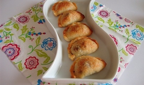 • 3 كوب طحين <br /> • 2/1 1 ملعقة صغيرة من البيكنج بودر<br /> • 1 ملعقة صغيرة ملح<br /> • 3/4 كوب زيت الذرة <br /> • 1 كوب ماء دافئ <br /> • مقادير الحشوة :- <br /> • 1 بصلة بيضاء كبيرة مفرومة<br /> • 1 ملعقة كبيرة سمنة للبصل<br /> • 1 كوب جوز مفروم<br /> • 1 ملعقة كبيرة سمنة للجوز <br /> • 2 ملعقة كبيرة سمنة للحم <br /> • 500 جرام لحم مفروم<br /> • ملح وفلفل أسودطريقة التحضير :