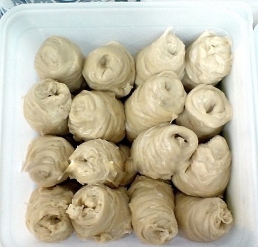 بعد الساعتين خذى قطعة من العجين وابرميها أو لفيها على شكل إسطوانة ثم