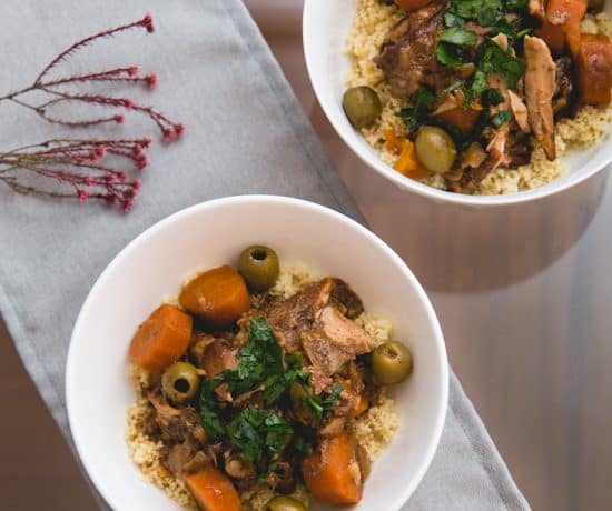 • 8 قطع دجاج بدون جلد • 4 حبة جزر متوسط الحجم مقطع شرائح • 1 بصل أبيض متوسط الحجم مفروم • 1/3 كوب قراصيا ( برقوق مجفف ) • 1/2 كوب زيتون أخضر • 3 فص ثوم مفروم • 2 ملعقة كبيرة طحين • 2 ملعقة صغيرة بابريكا • 2 ملعقة صغيرة كمون • 1 ملعقة صغيرة قرفة • 2 ملعقة صغيرة زنجبيل طازج مفروم • 1 كوب مرق دجاج • 1 ملعقة صغيرة ملح • 1/2 ملعقة صغيرة فلفل أسود • كزبرة طازجة مفرومة للتقديم • شرائح ليمون للتقديمطريقة التحضير :