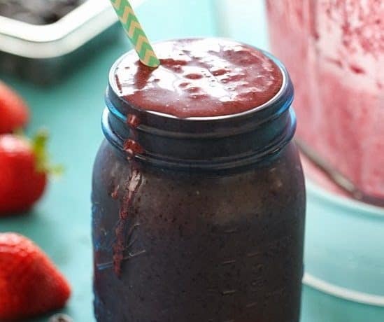 • 3/4 كوب توت مجمد أو مثلج فقط <br /> • 3/4 كوب شرائح فراولة طازجة <br /> • 3/4 كوب حليب اللوز بطعم الفانيليا ( غير محلى )<br /> • 1 ملعقة كبيرة زبدة الفول السودانى <br /> • التحلية حسب الذوق <br /> • 1/4 كوب ثلجطريقة التحضير :