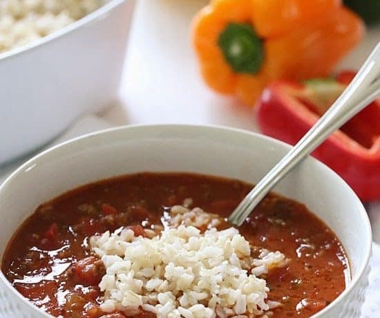 • 3 كوب أرز بنى مطهى • 400 جرام لحم مفروم • 1/2 كوب فلفل أخضر حلو مفروم • 1/2 كوب فلفل أحمر حلو مفروم • 1 كوب بصل مفروم ناعم • 3 فص ثوم مفروم • 2 علبة مكعبات طماطم • 4/3 1 كوب من صلصة الطماطم • 2 كوب مرق دجاج • 1/2 ملعقة صغيرة بردقوش مجفف • ملح وفلفل أسود حسب الذوقطريقة التحضير :