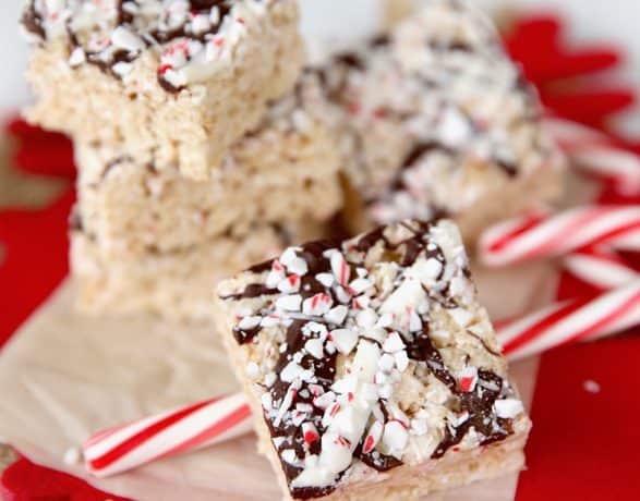 • 350 جرام مارشميلو صغير الحجم • 4 ملاعق كبيرة زبدة • 6 أكواب حبوب الأرز المقرمشة • 4/1 ملعقة صغيرة نكهة النعناع • شوكولاتة بيضاء مذابة • شوكولاتة شبه حلوة مذابة • 3 – 4 قطع حلوى النعناع، مسحوقةطريقة التحضير :