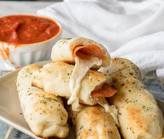 • عجينة بيتزا كراست • شرائح الببروني • أصابع جبن الموتزاريلا • 2 ملعقة كبيرة زبدة • 2/1 ملعقة صغيرة بودرة الثوم • 2/1 ملعقة صغيرة بقدونس مجفف أو أوريغانو • صلصة مارينارا أو كاتشب (للتقديم)