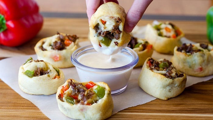 • قطع اللحم المطبوخة • مكعبات الفلفل الأحمر والأخضر الحلو • عجينة الكرواسون • جبن كريمي بالبصل والثوم المعمر • مايونيز للتقديمطريقة التحضير :