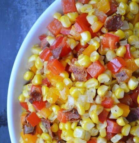 • 1 كوب مكعبات الفلفل الأحمر الحلو<br /> • 2/1 كوب مكعبات البصل<br /> • 3 أكواب حبات الذرة الطازجة<br /> • 1 كوب مكعبات الفلفل البرتقالي أو الأصفر الحلو<br /> • 4 شرائح لحم بقري مقدد، مفروم ومقلي<br /> • 2 ملعقة كبيرة زيتطريقة التحضير :