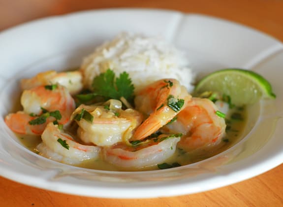 • 1 ملعقة كبيرة زيت نباتى • 1 كوب شرائح بصل رقيقة • 1/3 كوب بصل أخضر مفروم • 2 فص ثوم مفروم • 2/1 2 ملعقة كبيرة من معجون الكارى الأخضر التايلاندى • 1 علبة حليب جوزالهند • 1/4 كوب ماء • 2 ملعقة كبيرة صلصة السمك • 1 ملعقة كبيرة سكر بنى • 2 كيلو روبيان جامبو مقشر • 1/4 كوب ريحان أو كزبرة مفرومة أو كلاهما معا • ليمون للتقديمطريقة التحضير :