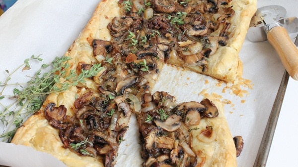 • 8 حبات فطر كبير الحجم • 2/1 1 ملعقة كبيرة من الزبدة • 1/4 كوب سويت آند شيرى صوص • 1 حبة بصل أحمر مقطع شرائح • 1 كوب جبن رومى مبشورة • 1 ملعقة صغيرة زعتر طازج • 1/2 ملعقة صغيرة ملح • 1/2 ملعقة صغيرة فلفل أسود • 1 عجينة باف باسترىطريقة التحضير :
