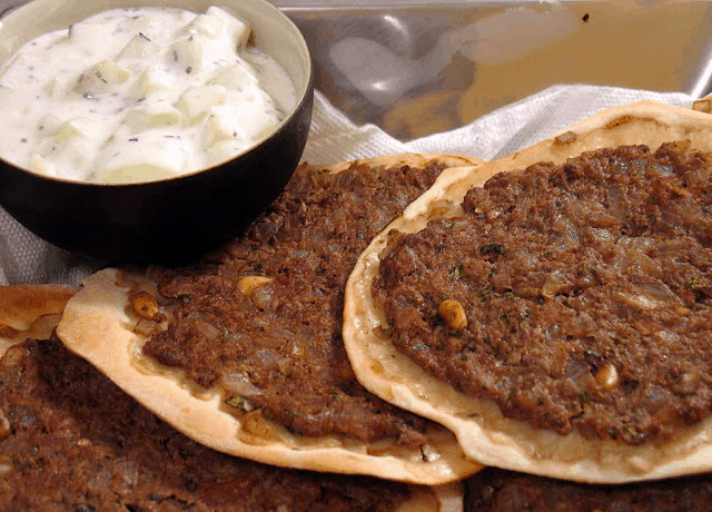 مكونات العجين: - 3 أكواب طحين. - 1 ملعقة صغيرة ملح. - 1 كوب ماء دافئ. - 1 ½ ملعقة كبيرة خميرة جافة. - ¼ ملعقة صغيرة سكر. - 2 ½ ملعقة كبيرة زيت زيتون.مكونات الحشو: - ½ كيلو لحم مفروم. - 2 بصلة متوسطة. - 2 حبة طماطم كبيرة. - 3 ملاعق كبيرة صلصة طماطم. - ½ كوب أوراق بقدونس. - 1 ملعقة كبيرة دبس رمان. - ¼ كوب صنوبر محمص. - 1 ملعقة كبيرة عصير ليمون. - 1 ملعقة صغيرة بهار لحم. - ¼ ملعقة صغيرة قرفة مطحونة. - 1 ملعقة صغيرة ملح. - ½ ملعقة صغيرة فلفل. - ¼ ملعقة صغيرة شطة. - 2 ملعقة كبيرة زيت زيتون.طريقة التحضير :
