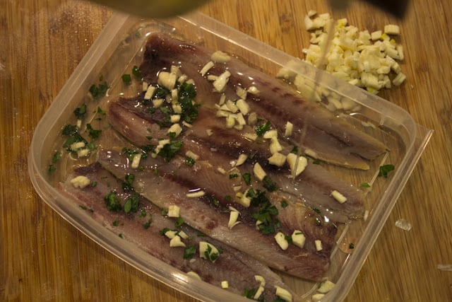 الرنجة أو السردين فى ماء أو حليب للتخلص من الملح قليلا .