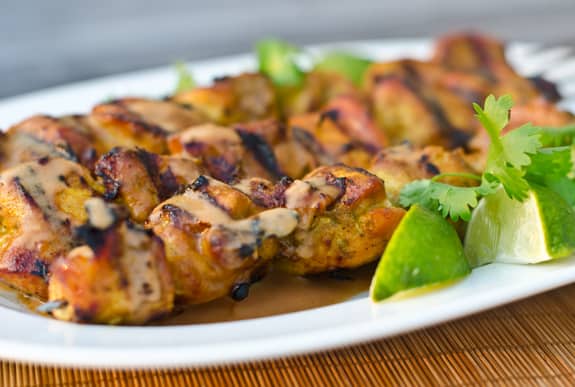 قدمى أسياخ الدجاج المشوى مع صلصة زبدة الفول السودانى التايلاندية