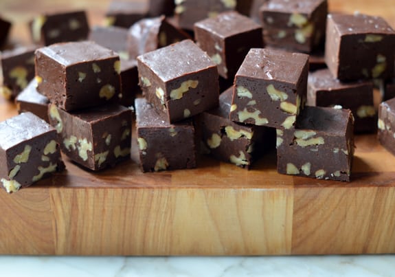 • 450 جرام شوكولاته نصف محلاة مفرومة • 60 جرام شوكولاته داكنة مفرومة • 1/2 ملعقة صغيرة بيكنج صودا • 1/8 ملعقة صغيرة ملح • 1 علبة حليب مكثف محلى • 1 ملعقة كبيرة فانيليا سائلة • 1 كوب جوز ( عين جمل ) مفروم خشن