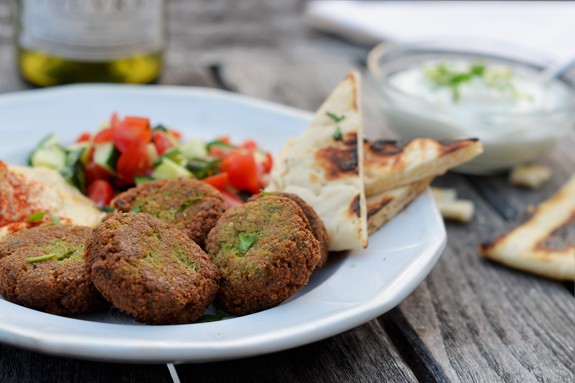 قدمى الفلافل العربية مع الخبز وسلطة الطحينة واللبن الزبادى واستمتعى