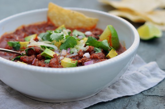 • 2/1 1 كيلو من اللحم المفروم • 2 ملعقة صغيرة ملح • 3/4 ملعقة صغيرة بيكنج صودا • 2 ملعقة كبيرة زيت نباتى • 1 : 2 حبة من البصل الأبيض المفروم • 4 فص ثوم مفروم • 1 فلفل أحمر حلو مفروم • 2 ملعقة كبيرة مسحوق الفلفل الأحمر الحار • 1 ملعقة كبيرة صلصة حارة • 1 ملعقة كبيرة كمون • 1 ملعقة صغيرة أوريجانو مجفف • 1/2 ملعقة صغيرة كزبرة مطحونة • 1 ملعقة صغيرة بابريكا • 1/4 ملعقة صغيرة قرفة • 1/2 ملعقة صغيرة سكر • 2 ملعقة كبيرة دقيق الذرة • 3 كوب مرق لحم • 1 علبة طماطم مفرومة • 1/4 كوب معجون طماطم • 2 ملعقة كبيرة دبس السكر • 1 ملعقة كبيرة عصير ليمون • للتقديم : كزبرة خضراء ، ليمون ، ساور كريم ، جبن ، بصل أخضرطريقة التحضير :