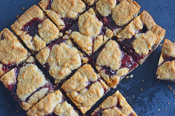 • 1/2 كوب جوز • 1 كوب طحين • 1/2 كوب جوزالهند • 1/4 كوب شوفان • 1/4 ملعقة صغيرة ملح • 1/4 ملعقة صغيرة بيكنج بودر • 1 عصى زبدة لينة • 1/2 كوب سكر • 1/4 كوب سكر بنى • 1 بيضة كبيرة • 1/2 كوب مربى التوت