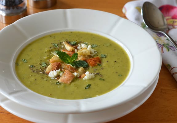 مقادير الشوربة :- • 3 ملعقة كبيرة زيت زيتون • 2 حبة بصل أبيض مفروم • 4/3 2 كوب من البازلاء الخضراء المجمدة • 1 باقة ( 450 جرام ) من الهليون المقطع • 4 كوب مرق دجاج • 4/1 1 ملعقة صغيرة من الملح • 1/4 ملعقة صغيرة فلفل أسود • 1 ملعقة كبيرة عسل • 1/2 كوب جبن فيتا • 2/1 1 ملعقة كبيرة من عصير الليمون • 1/3 كوب نعناع طازج مفروم + المزيد للتزيين مقادير الخبز المحمص :- • 1 خبز لبنانى كبير مقطع مكعبات • 2 ملعقة كبيرة زيت زيتون • 1 فص ثوم • 1/4 ملعقة صغيرة ملحطريقة التحضير :