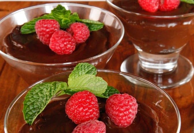 وزعي موس الشوكولاتة في أوعية التقديم.