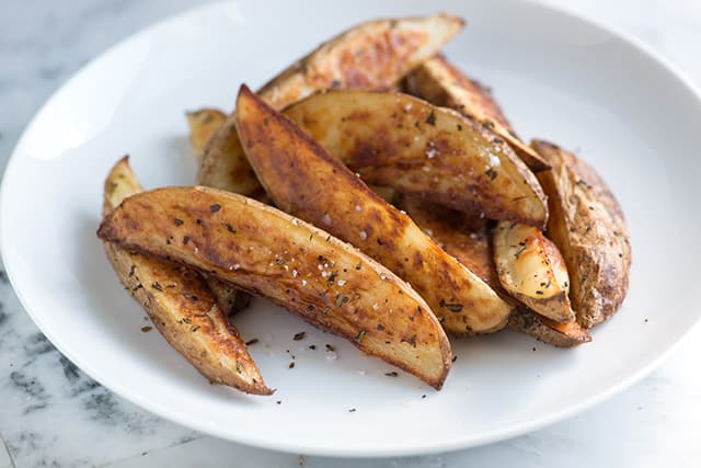 • 4 حبات بطاطس كبيرة غير مقشرة • 1/4 كوب زيت زيتون • 1 ملعقة صغيرة ملح • 1/2 ملعقة فلفل اسود • 1 ملعقة اكليل الجبل مفروم • 1/2 ملعقة صغيرة ملح خشنطريقة التحضير :