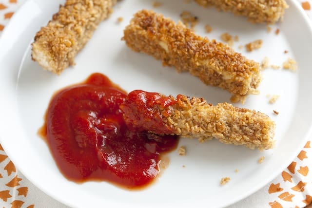 -اخلطي مسحوق الارز المحطون مع الدقيق الاسمر غطي الشرائح واحده تلو الاخري في الخليط .